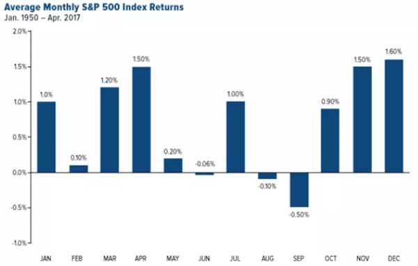 위 그래프는 S&P 500 Index를 1950년부터 2017년까지 통계적으로 분석한 결과 입니다. 통상적으로 9월은 하락한 경우가 많고, 대체적으로 겨울이 여름보다 주가적인 흐름에서 긍정적으로 나타나고 있습니다. 1 월 효과라는 말도 있는데, 새해 초에 투자자들은 어떠한 결심 또는 복수심에 불타올라 주식 시장에서 공격적인 투자를 하여 소형주, 가치주 등의 가격을 올리기도 합니다. 장기적인 투자를 하는 경우, 9월의 하락을 투자 시점으로 가져가는 것도 통계적으로 나쁘지 않은 선택이라고 할 수 있겠습니다.