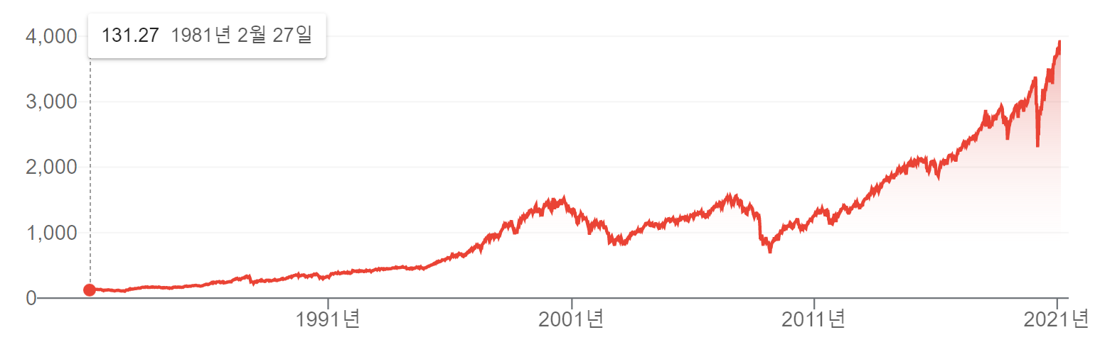 참고로, 앞으로 언급 되는 (다른 기사나 정보도 마찬가지) 약세장과 강세장의 시점은 아래와 같습니다. 물론, 하락하면 약세장, 상승하면 강세장인 것은 맞지만, 좀 더 장기간의 관점에서 생각해야 한다는 것입니다. 아래에 약 40년의 S&P 500 지수를 참고하시길 바랍니다.
